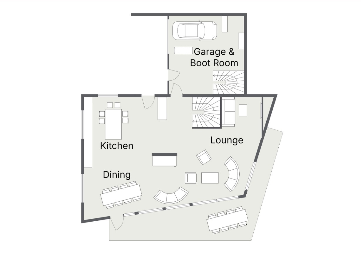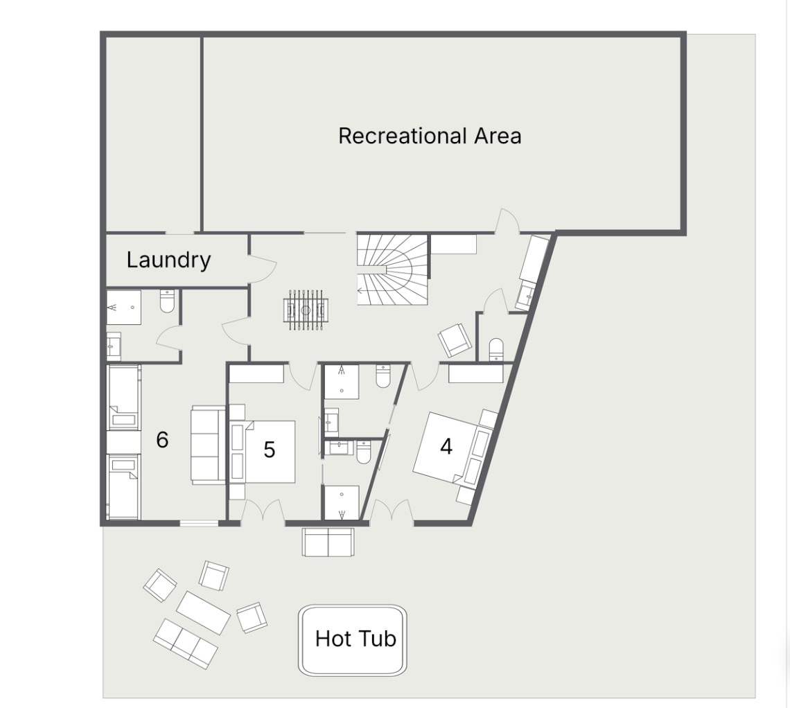 In total there are 6 bedrooms allowing the chalet to sleep up to 12 people. The master suite, as you would expect, is an indulgent affair. Set on the first floor it enjoys the best of the views and also features a luxurious en-suite. Next to this there is a second versatile suite which can either be accessed from the main chalet as a guest bedroom, or by an independent entrance. The layout has been made in this way for guests travelling with staff, allowing them to integrate with your family in a discreet and convenient manner, whilst also giving them their own space and privacy when they are not working. There are a further two regular rooms on the lower ground level, as well as two bunk rooms which are suitable for use by both children or adults meaning the chalet will suit a wide range of groups. Five of the six rooms are en-suite, with only the smaller of the bunk rooms on the top floor sharing facilities with one of the two main suites.
